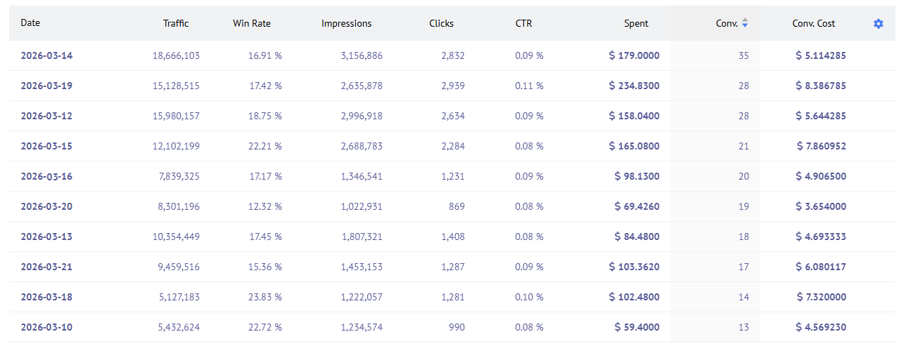 Since we were working with push notifications, we naturally decided to focus on subscriber age targeting, as well. To adjust the traffic win rate equally and balance the CPA costs across all subscription age segments, we split each subscriber age main segment into separate campaigns, with different bid setups.