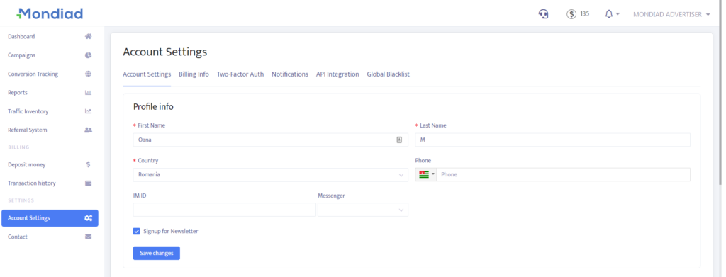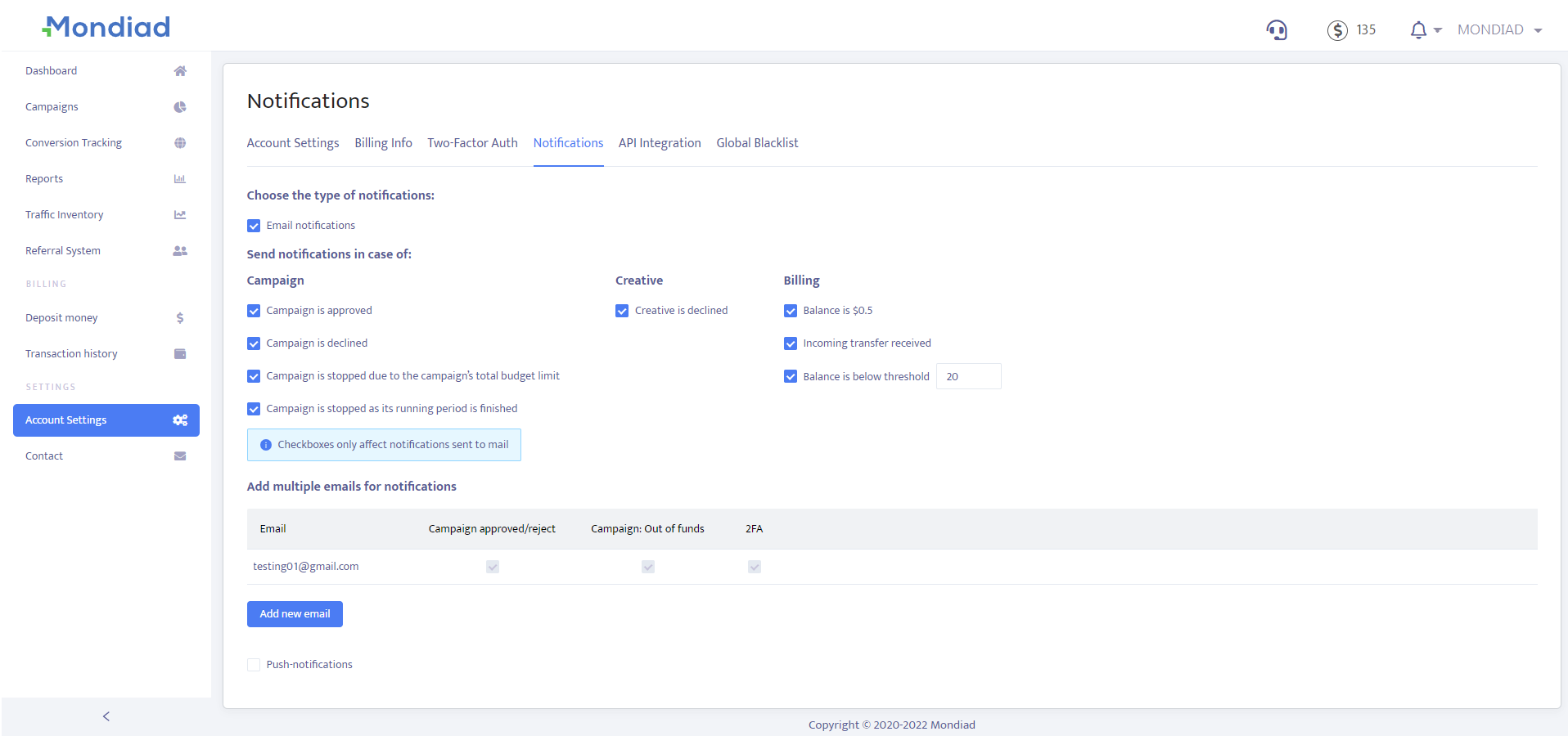 Enable/Disable the Two-Factor Authentication. We recommend using the Two-Factor Authentication feature for the safety of your account.