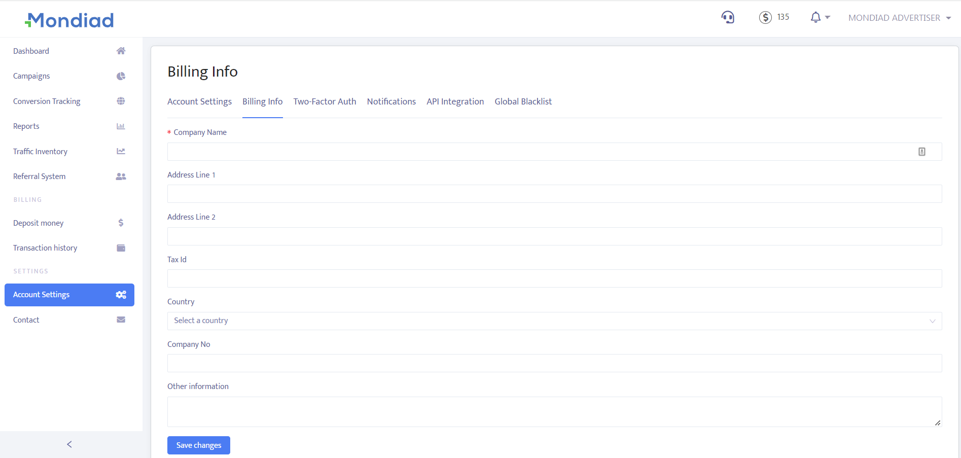 By default, your billing information will be automatically filled in. If needed, you can update billing info such as: Company Name, Address, Country, Tax Id, Company No, other information.