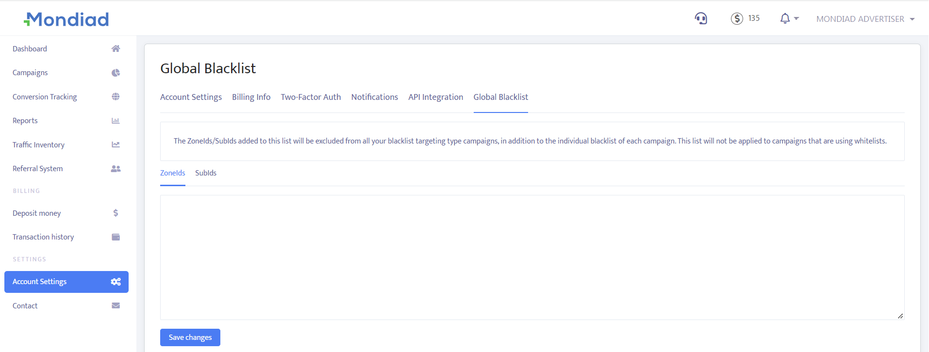 The ZoneIds/SubIds added to this list will be excluded from all your blacklist targeting type campaigns, in addition to the individual blacklist of each campaign. This list will not be applied to campaigns that are using whitelists.