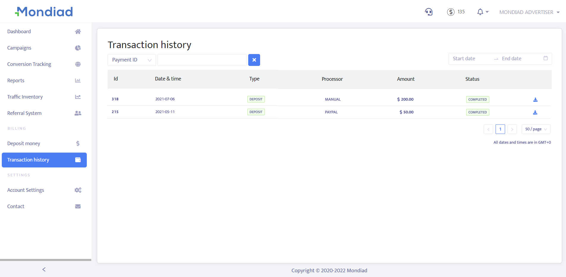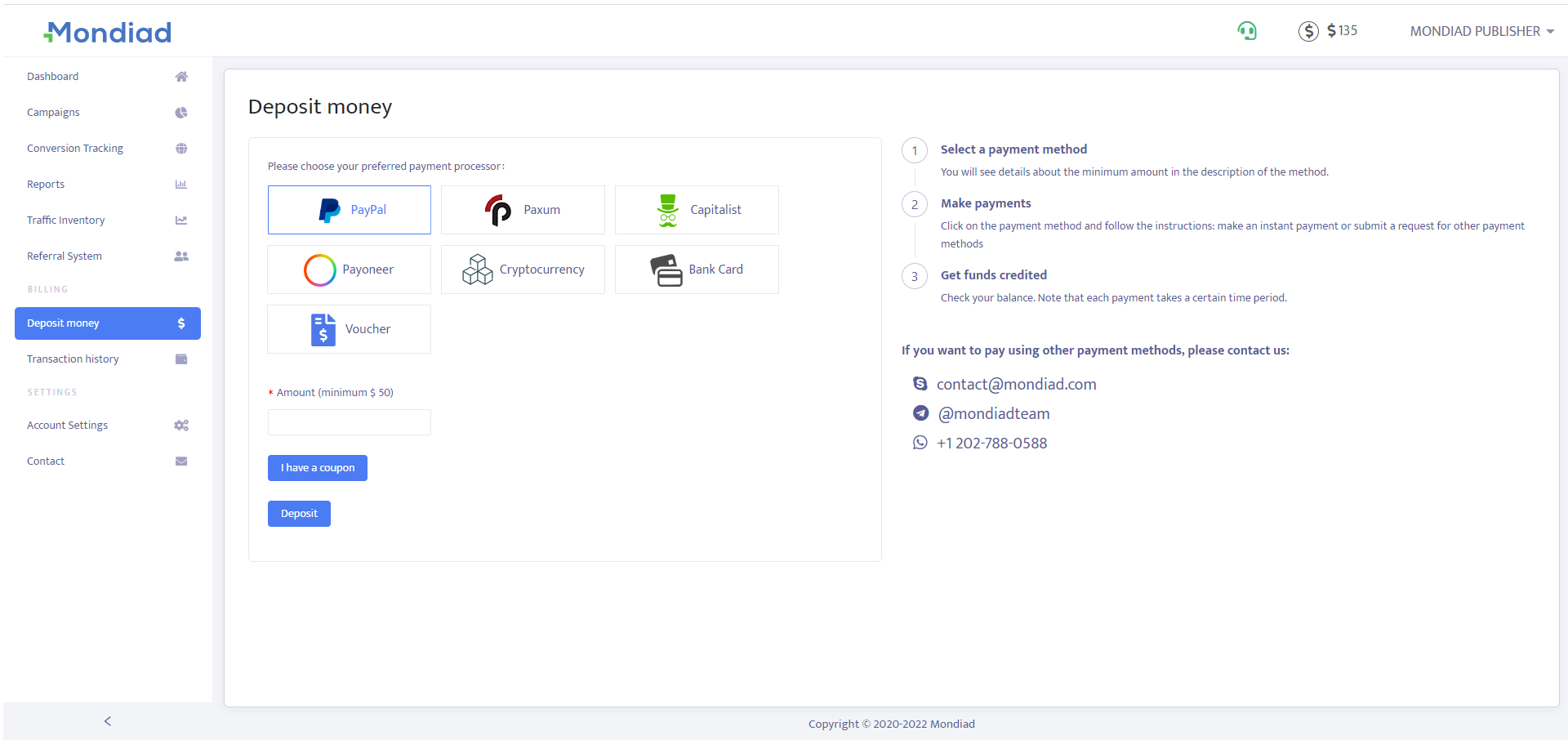 Moving on to the Deposit Tab, here you can deposit money for your ad campaigns, make an instant payment or submit a request for other payment methods.