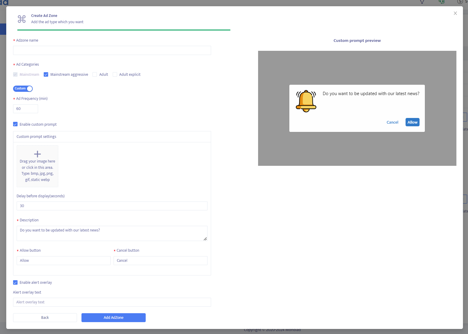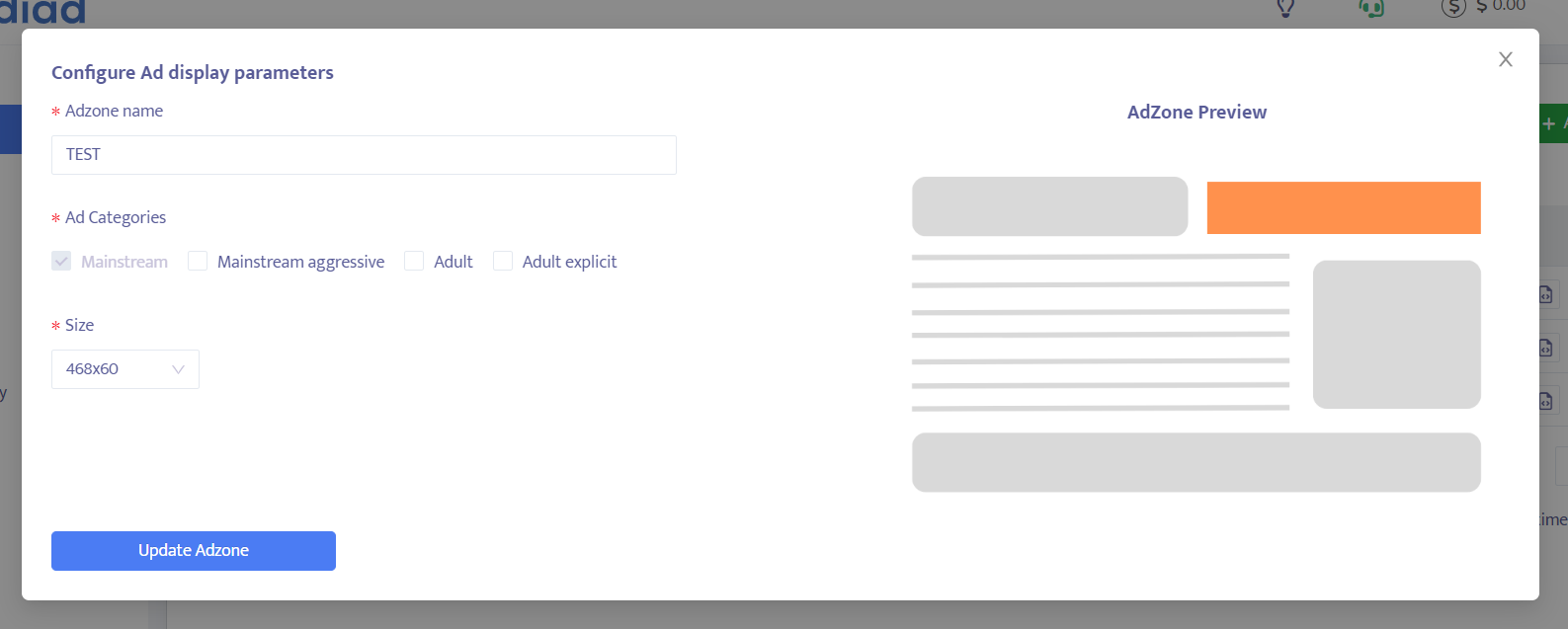 5. Configure the settings according to your needs. Each ad zone has its own customizable ad display parameters.