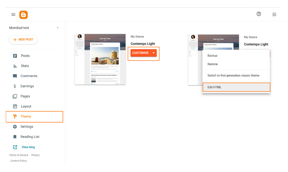 Sign in to your Blogspot account and head over to your website theme settings, namely the “Theme” section in the left menu.