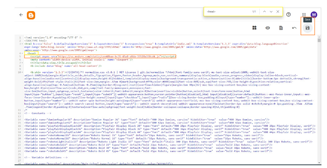 To navigate and find the spot to place your Mondiad ad code easier, use the CTRL + F command on your keyboard to look for the <head> tag.