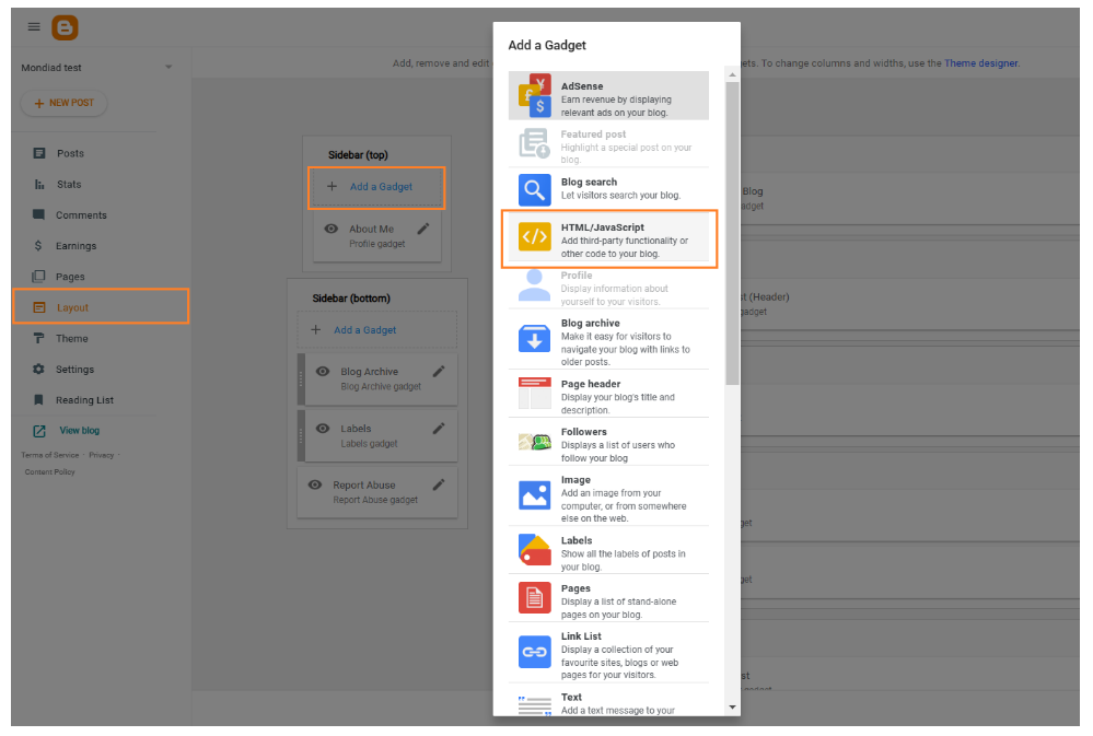 1.2 Method 2: Insert the Mondiad ad code using a HTML/JavaScript gadget.