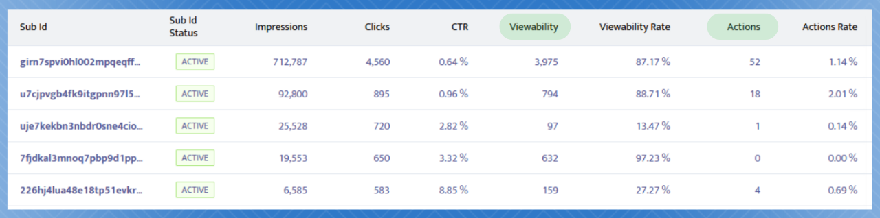After having our campaign run for a while so our rule optimization algorithm can adjust to the campaign setting, we can now have a look at our stats. By looking into our reports, we can now quickly spot which segments are performing and which are not by looking at the Viewability and Actions columns.