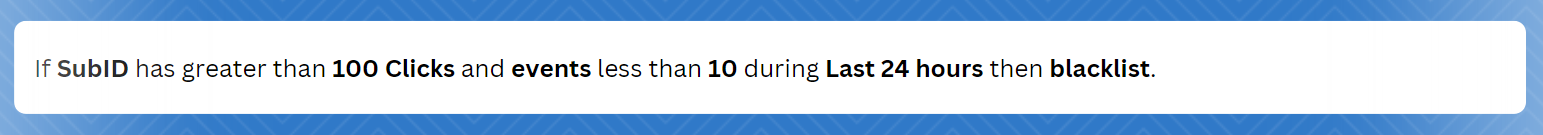 To get familiar with all rules parameters as well as setting them up, you can read more here. In this case, we want to remove SubIDs which generate more than 100 clicks but less than 10 events.