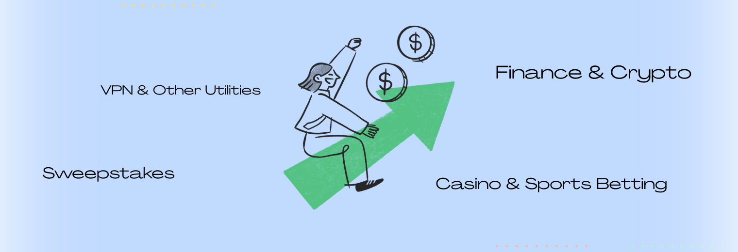 In terms of verticals, you can always focus on evergreen niches like e-commerce or app installs(mainly antivirus and cleaner apps), lead-gen sweepstakes, Betting, Casino, Mobile content (Carrier billing) or Nutra.