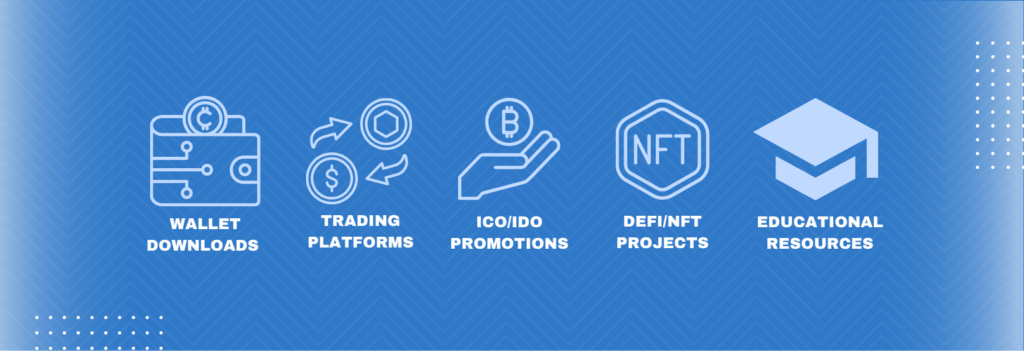 • Crypto Exchanges: Promotions for cryptocurrency exchange platforms where users can swap one cryptocurrency for another.