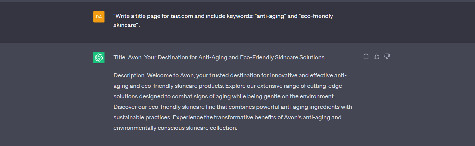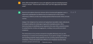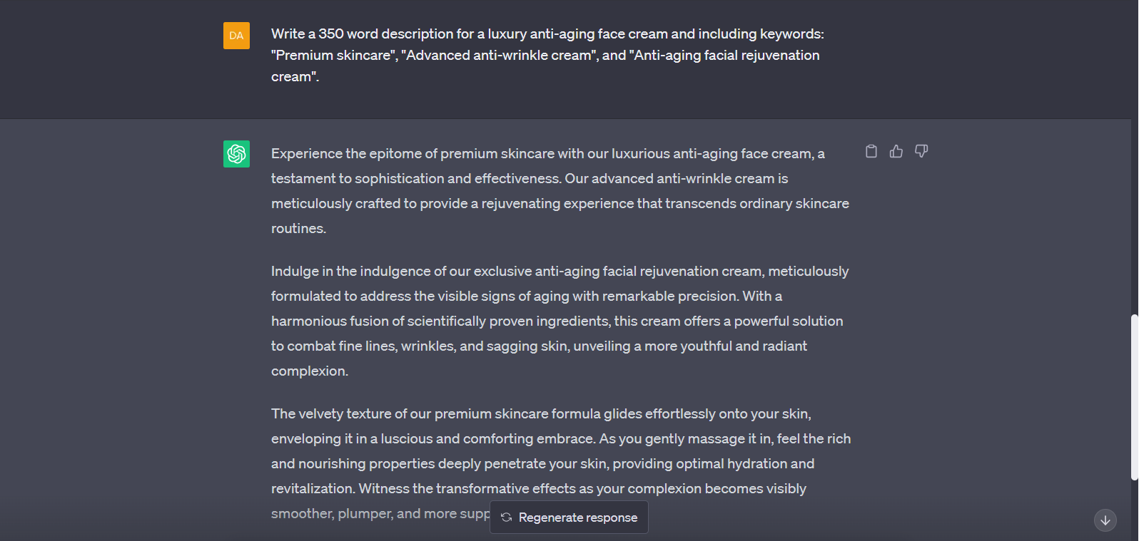 “Write a [number] words description for a [product] including keywords: “keyword 1”, “keyword 2” etc.”