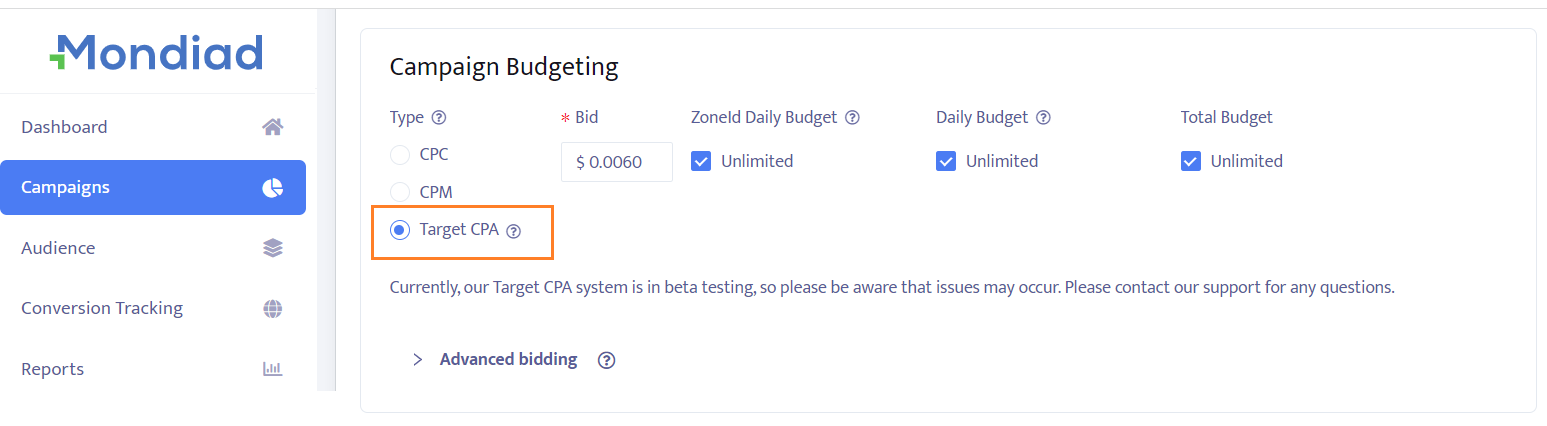 Selecting TargetCPA as your bidding option when creating a campaign in Mondiad will require you to choose how much you want to pay per conversion.