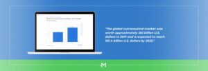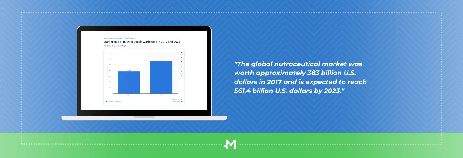 According to Statista, the global nutraceutical market was worth approximately 383 billion U.S. dollars in 2017 and is expected to reach 561.4 billion U.S. dollars by 2023.