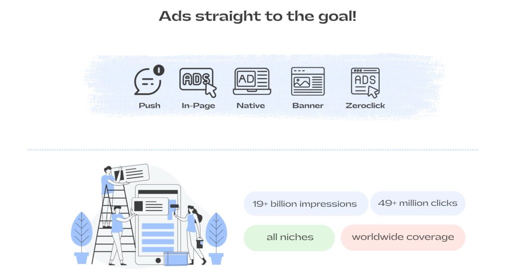 Ad networks typically provide access to exclusive traffic pools that are less competitive, meaning lower costs and better ROI. Plus, the diverse ad formats available (push notifications, native ads, popunders, banners) help keep campaigns fresh and engaging.