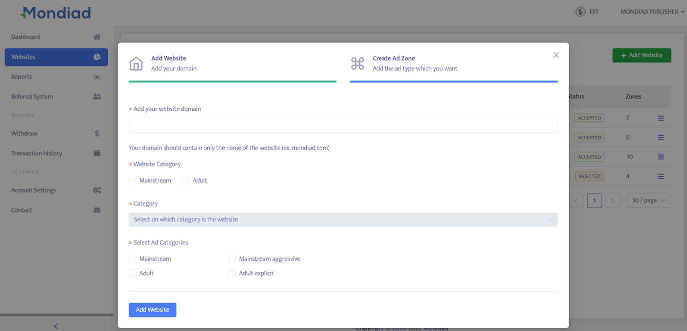 • Select your website category: Mainstream / Adult;