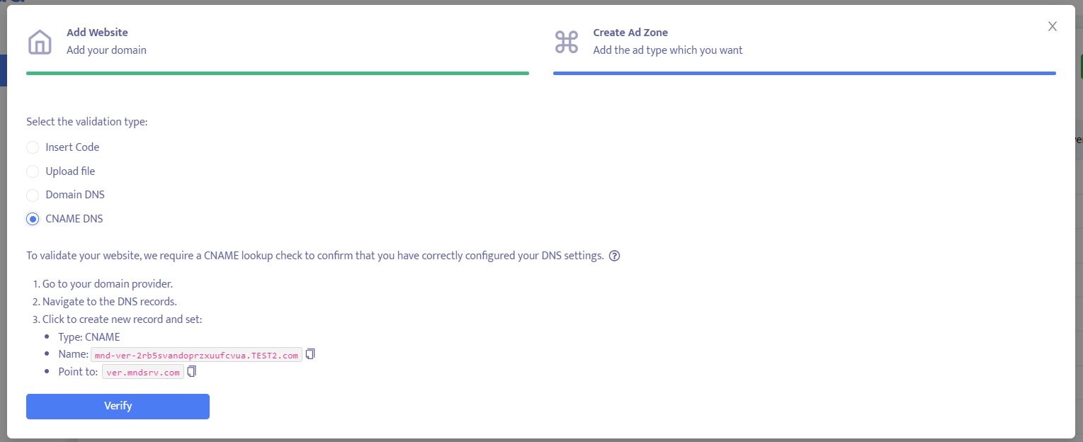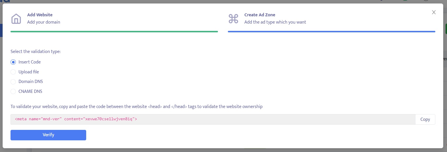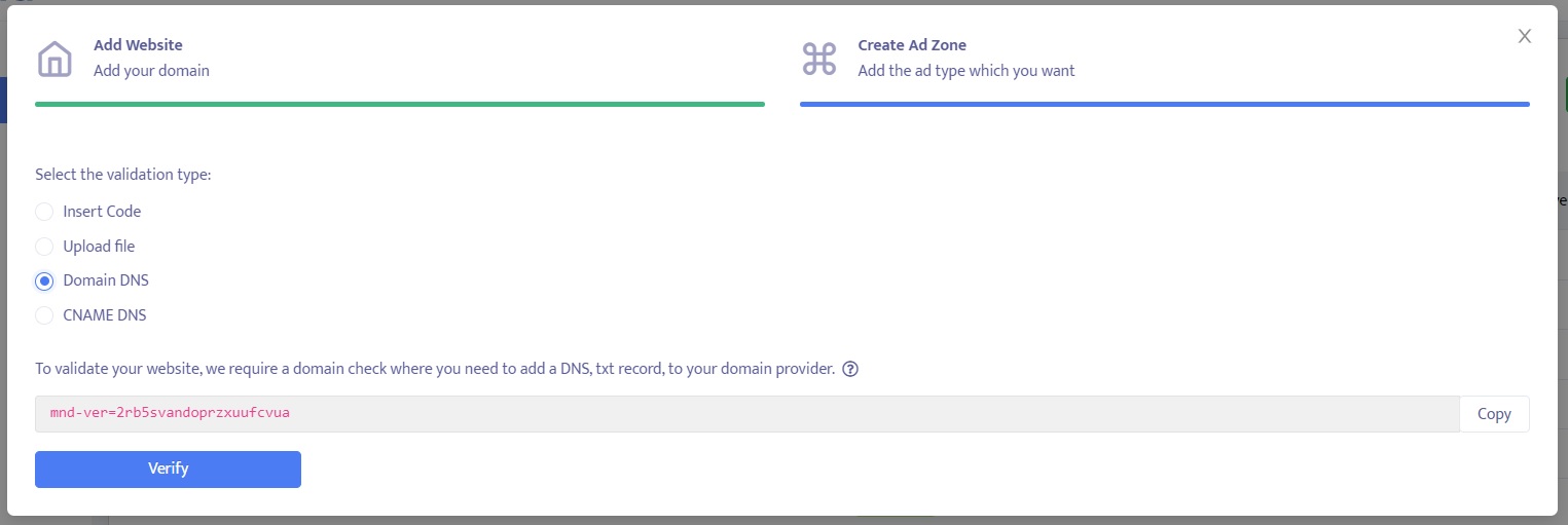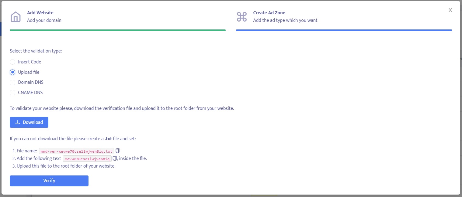 Before you can add ad zones from Mondiad, it is essential to validate your website. Website validation is a crucial step that ensures the authenticity and ownership of a domain. By validating your website, you establish trust with advertisers and advertising platforms, like Mondiad.
