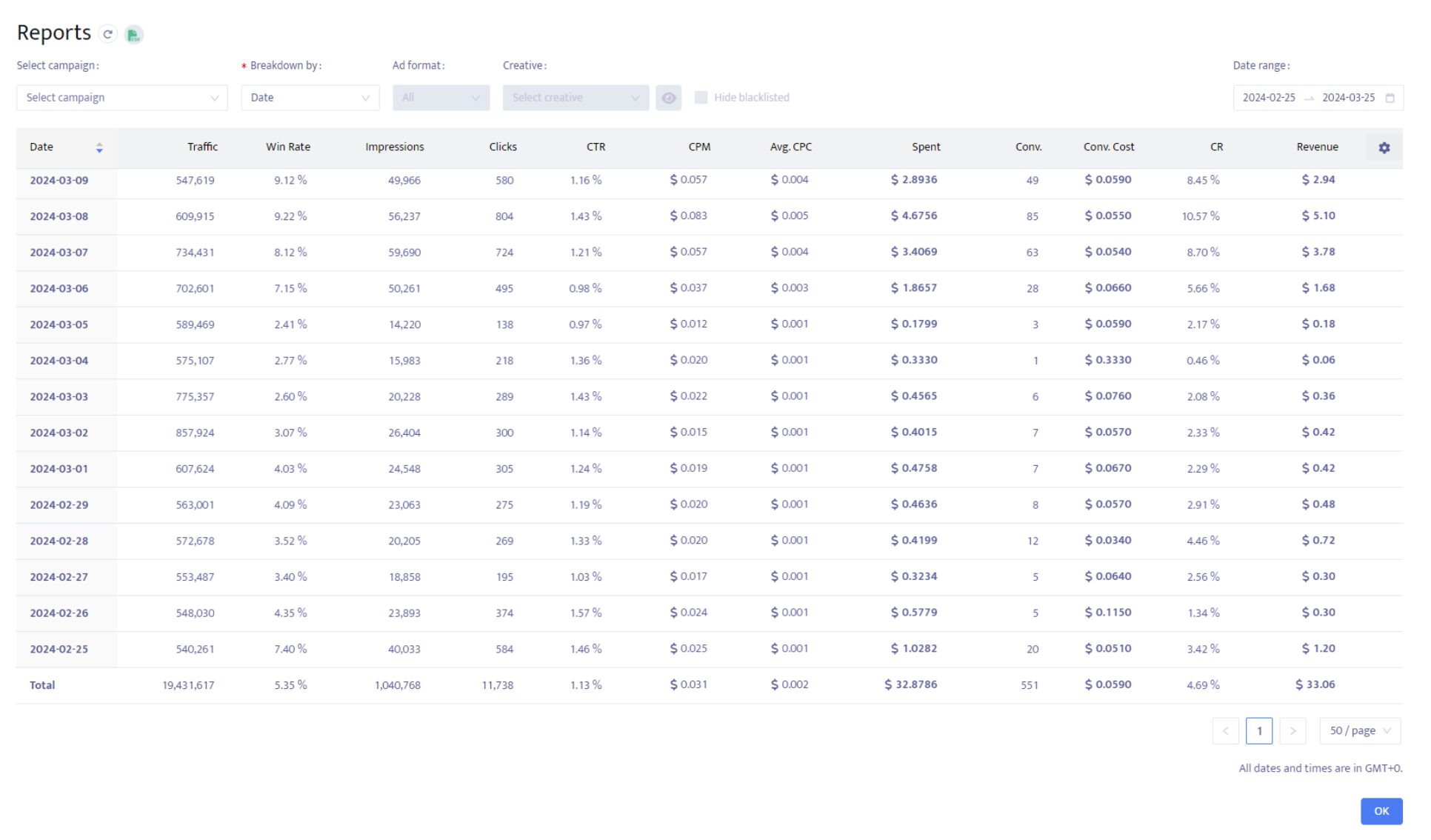 | Bidding | TargetCPA: 0.05$, no daily limit |