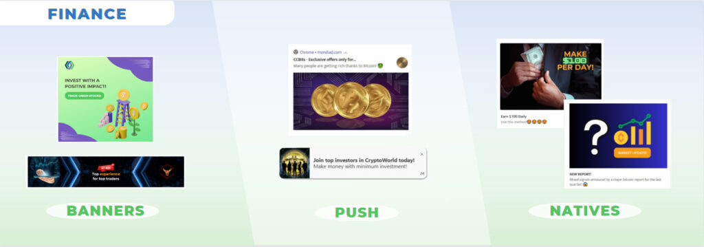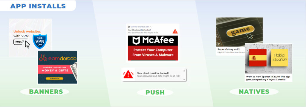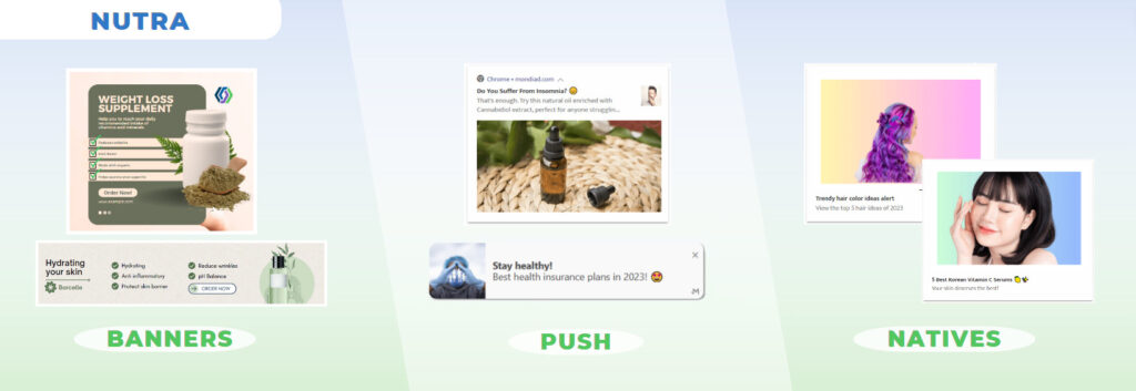 As per usual, there are no limitations when it comes to choosing an ad format for your utilities offers. In the image above, you can see some ad creatives examples, made with push, native and banner ads, for inspiration.