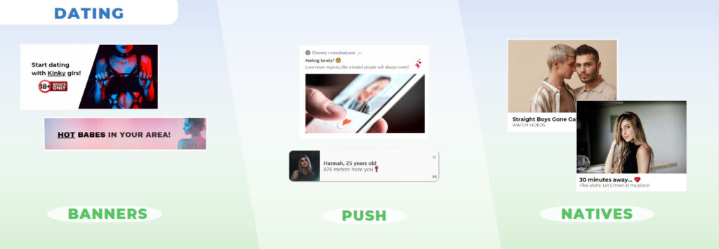 In advertising, the dating niche is promoting offers designed to attract individuals to join dating platforms, sign up for memberships, or engage in specific dating-related activities. Dating ads can vary widely in style and content, ranging from serious and detailed profiles to more casual and playful ones. Some dating ads may emphasize specific attributes, such as physical appearance, hobbies, or interests, while others may focus on personality traits or relationship goals.