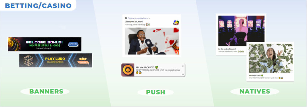 To put it simply, casino/betting ads encompass a wide variety of promotional offers and strategies aimed at attracting players to casinos and betting platforms. These type of ads typically promote various aspects of the casino experience and the special offers that players can enjoy, including welcome bonuses, free spins, exclusive games, cashback deals, loyalty programs and so on.