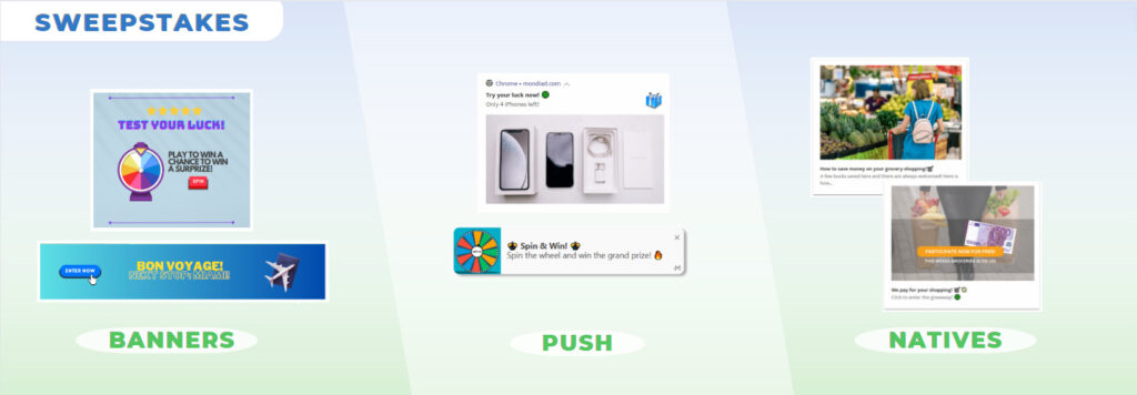 Sweepstakes can be a fun and effective way for businesses to connect with their customers, generate excitement, and increase brand visibility. This type of ads represent a promotional contest or giveaway where participants have the opportunity to win prizes based on luck, rather than skill, usually in exchange for a piece of information like their email address. The usual prizes showcasted may include cash, vacations, gift cards, electronics, or any other items of value.